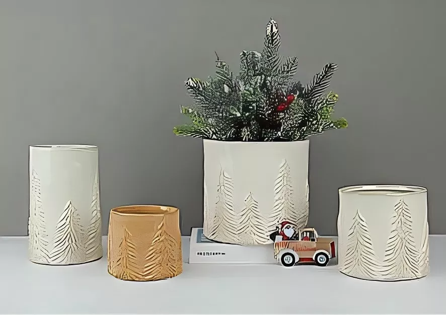 Seri vas EMBOSSED Natal kalebu set saka keramik vasik kanthi tlapukan lan pot kembang, sing nampilake pola evergreen klasik pola. Ukuran saka plencers succulent cilik kanggo vas, saben potongan sing dirancang kanggo nambah sentuhan alam sing alami, percoyo menyang dekorasi omah sampeyan. Pilihan warna putih lan garing, asring dipasangake karo aksen beri beri lan lapisan "salju", nggawe seri fokal sing sampurna kanggo nggawe swasana sing anget lan ngajak.