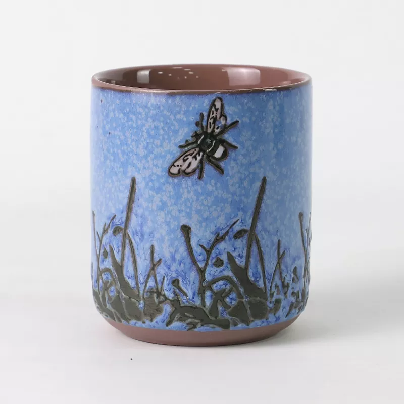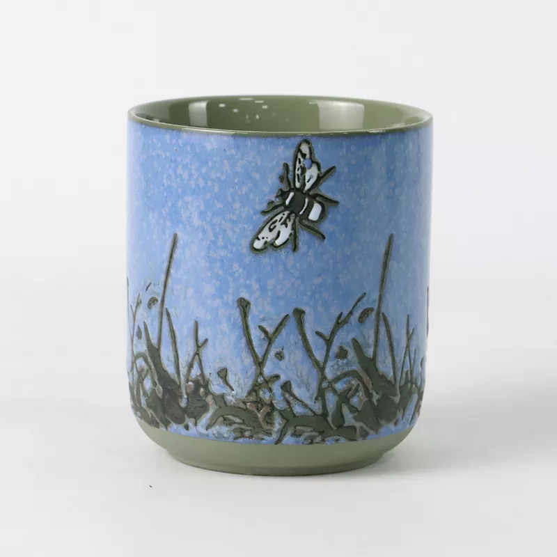 Serangga lilin keramik-candhi nyerang inspirasi saka perumpamaan alami "simbiosis cordyceps," njupuk inti estetika wetan klasik lan kaendahan mistik. Iki nyampurnakake cemlorot lemar sing dhuwur suhu kanthi hiasan under sing dicet kanthi tangan, ngalami puluhan pangaturan lan perbaikan kanggo pungkasane nggawe telung warna teken: Montry Night Blue, Green Green, lan Indigo sing apik banget. Tembok njaba cangkir kasebut padha karo langit sing akeh banget disiram nganggo flecks emas sing apik, kaya manawa cemlorot saka cara susu ditahan ing palem sampeyan; Tembok batin nggunakake cemlorot murni, jelas minangka pangilon, nggawe kontras visual sing kuwat karo tekstur langit lintang ing njaba, nuduhake rasa isin ing interplay saka cahya sing entheng lan bayangan. Kupu-kupu sing dicet tangan, gagang suket, lan pola dandelion ing sisih ngisor, digawe kanthi apik dening para tukang sing berpengalaman, lincah lan sregep, ketoke ujar siklus urip lan simbiosis. Saben tuwung minangka karya seni sing unik, nampilake penghormatan kanggo alam lan prayaan urip.