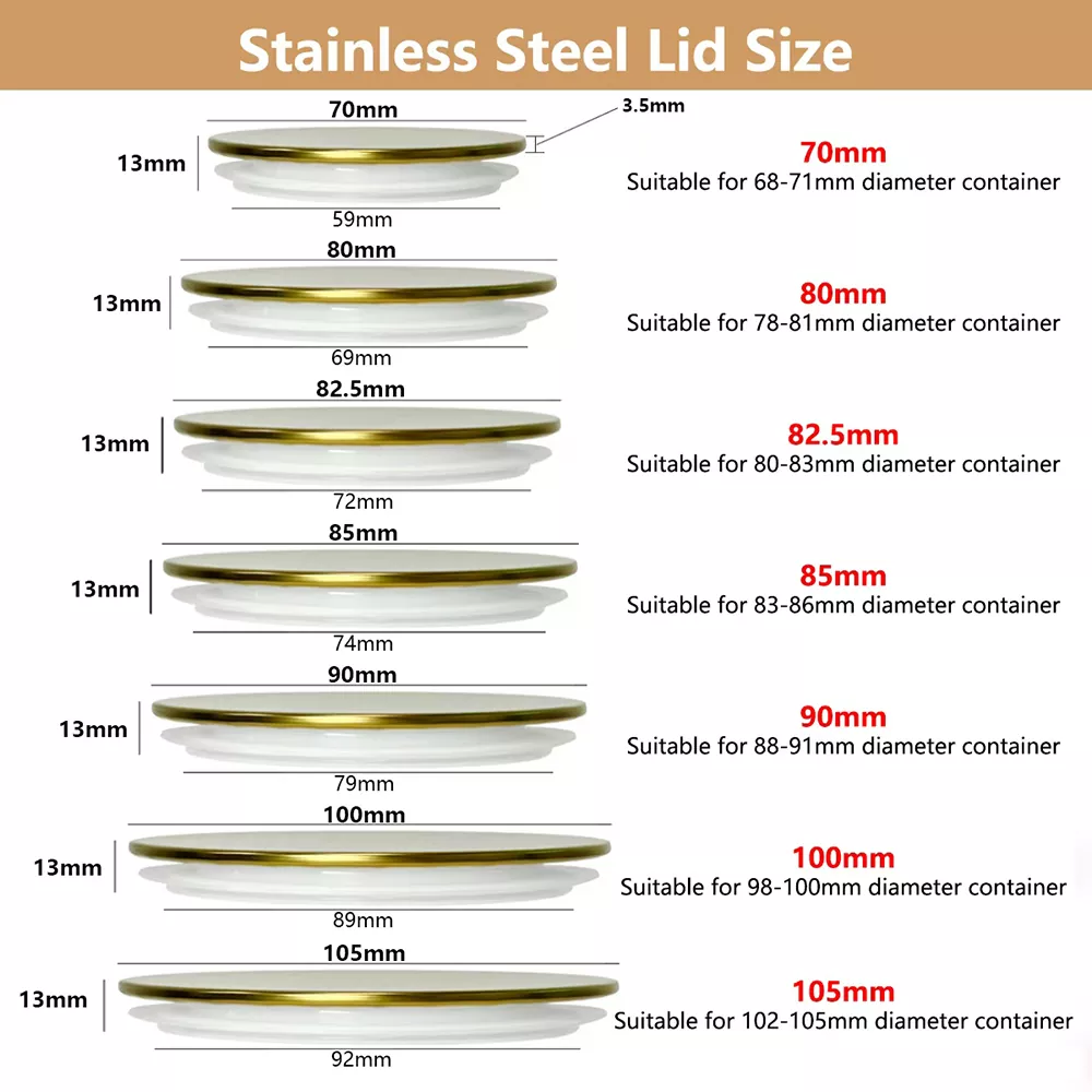 Lids jar stainless steel layar percetakan lilin kasedhiya ing macem-macem ukuran, kabeh kanthi dhuwur saka 13mm. Ukuran tartamtu lan bukaan wadhah sing kompatibel ditampilake ing ngisor iki:
